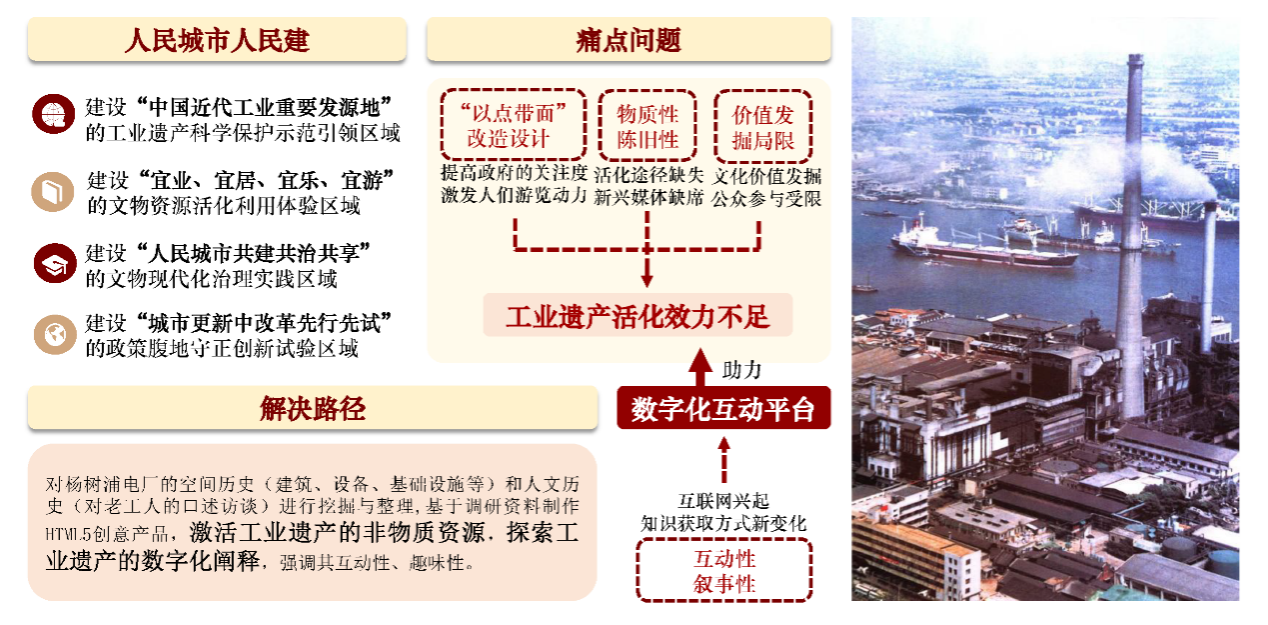 在“人民城市人民建”的重要理念与高校学生的专业知识的综合背景之下,本项目组关注到工业遗产保护因缺乏数字化互动平台而活化效果不佳这一痛点问题,期待以上海杨浦生活秀带国家文物保护利用示范区创建为契机,抓住历史建筑(包括工业遗产)的“网红”势头,以杨树浦发电厂为研究案例,开发在线文创产品,实现工业遗产、人文历史的可视化展示。基于杨树浦发电厂案例探索滨江沿线各工业遗产数字化可行性,为杨浦滨江游览者提供与历史建筑互动、挖掘滨江记忆的新途径。